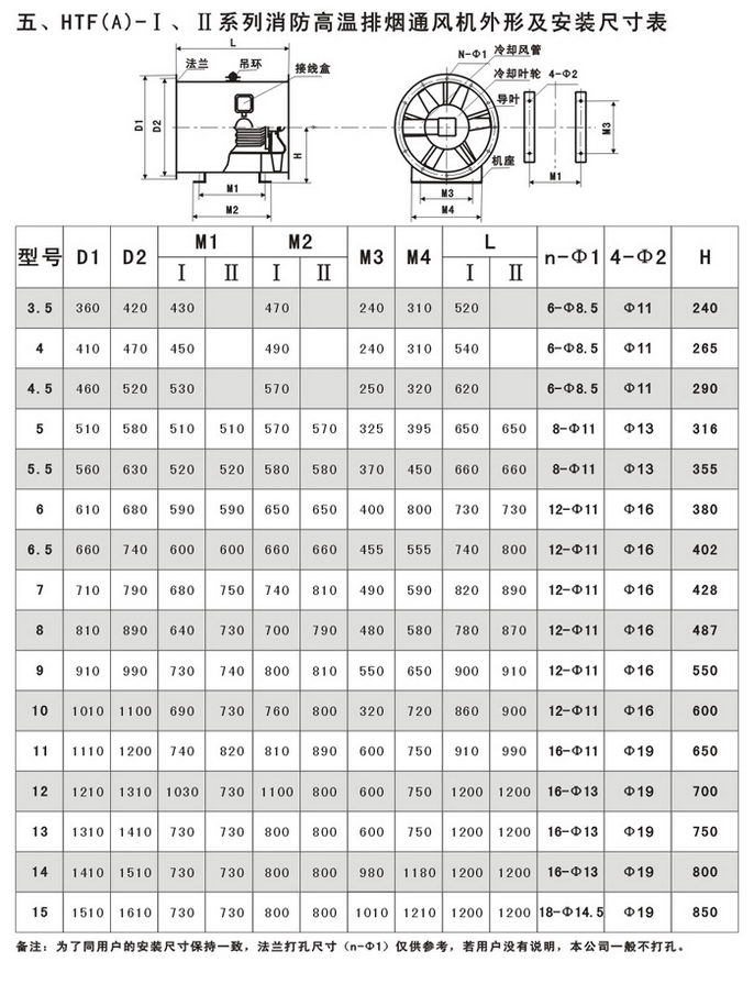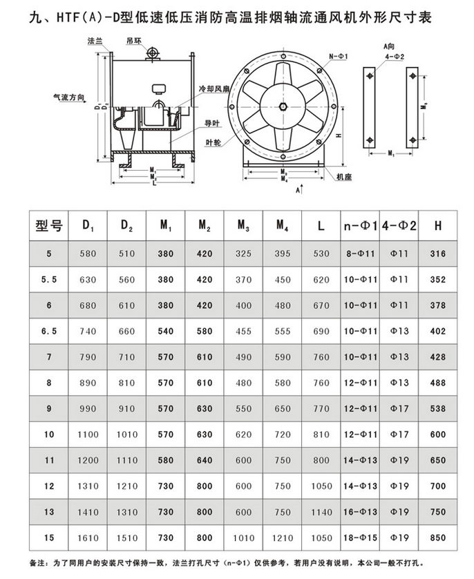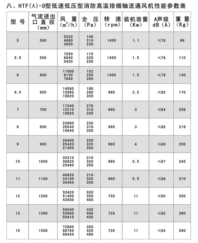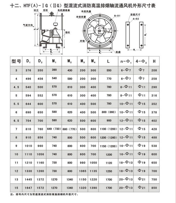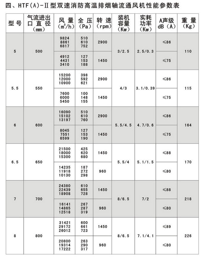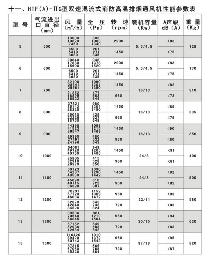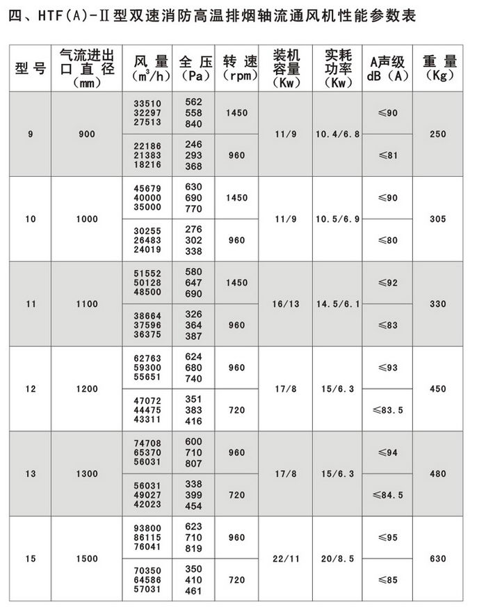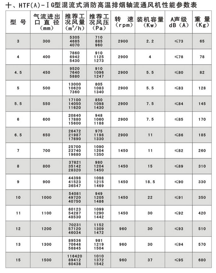 4.适用范围广:可以根据高级民用建筑的不同要求,采用变速或多速驱动形式,以达到一机两用(即常用通排风和消防时高温排烟)的目的;叶型分为轴流式(HTF(A)-Ⅰ、Ⅱ)和混流式HTF(A)-IG,亦可制作屋顶式、消音式。